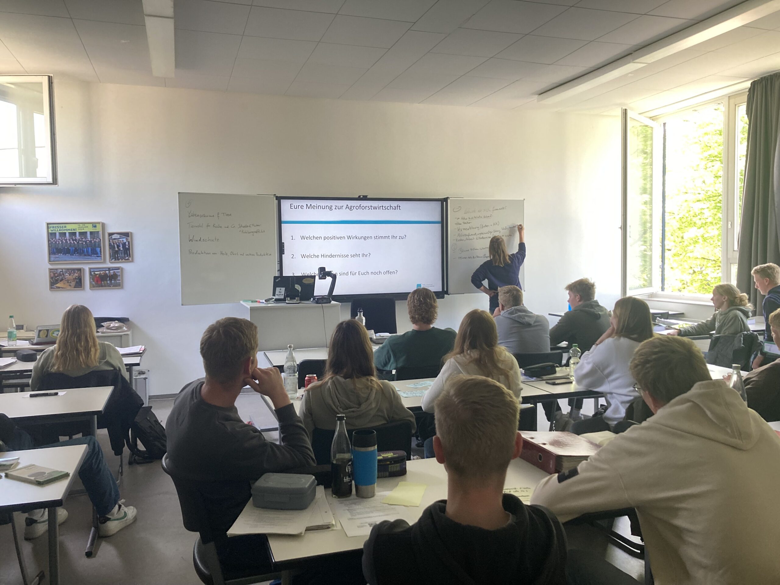 Eine Berufsschulklasse diskutiert die Potenziale und Herausforderungen von Agroforstsystemen. Foto © Laura Schridde
